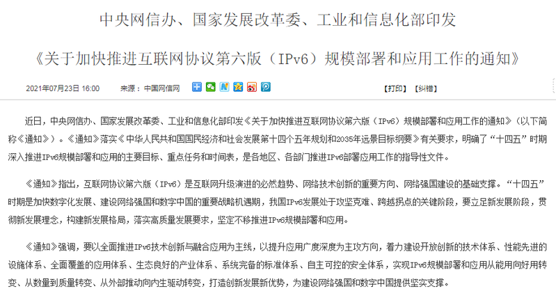 近日,中央網(wǎng)信辦、國(guó)家發(fā)展改革委、工業(yè)和信息化部印發(fā)《關(guān)于加快推進(jìn)互聯(lián)網(wǎng)協(xié)議第六版(IPv6)規(guī)模部署和應(yīng)用工作的通知》(以下簡(jiǎn)稱《通知》)。《通知》落實(shí)《中華人民共和國(guó)國(guó)民經(jīng)濟(jì)和社會(huì)發(fā)展第十四個(gè)五年規(guī)劃和2035年遠(yuǎn)景目標(biāo)綱要》有關(guān)要求,明確了“十四五”時(shí)期深入推進(jìn)IPv6規(guī)模部署和應(yīng)用的主要目標(biāo)、重點(diǎn)任務(wù)和時(shí)間表,是各地區(qū)、各部門推進(jìn)IPv6部署應(yīng)用工作的指導(dǎo)性文件。《通知》指出,互聯(lián)網(wǎng)協(xié)議第...