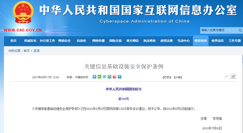 中華人民共和國(guó)國(guó)務(wù)院令第745號(hào)《關(guān)鍵信息基礎(chǔ)設(shè)施安全保護(hù)條例》已經(jīng)2021年4月27日國(guó)務(wù)院第133次常務(wù)會(huì)議通過(guò),現(xiàn)予公布,自2021年9月1日起施行。總理 李克強(qiáng)2021年7月30日關(guān)鍵信息基礎(chǔ)設(shè)施安全保護(hù)條例第一章 總 則第一條 為了保障關(guān)鍵信息基礎(chǔ)設(shè)施安全,維護(hù)網(wǎng)絡(luò)安全,根據(jù)《中華人民共和國(guó)網(wǎng)絡(luò)安全法》,制定本條例。第二條 本條例所稱關(guān)鍵信息基礎(chǔ)設(shè)施,是指公共通信和信息服務(wù)、能源、交...